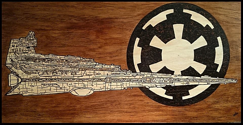 Cuadro pirograbado de un destructor imperial, vistos en las precuelas de Star Wars.
